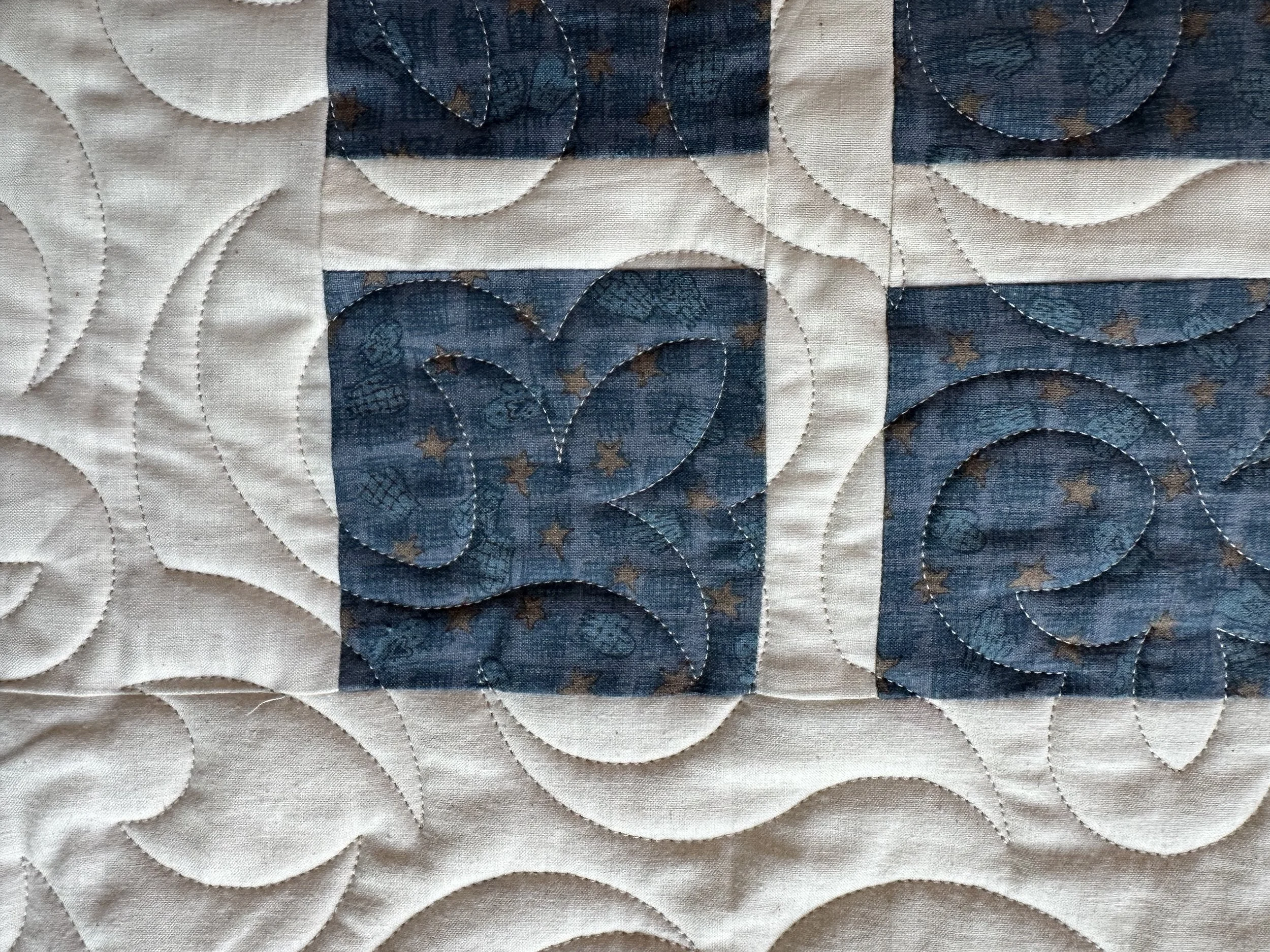 This quilt is made up of a variety of blue blocks and a white background. The backing is pieced together with striped and Americana fabric. The quilting pattern used is called 3 Leaf and the quilt measures 57” x 79”.