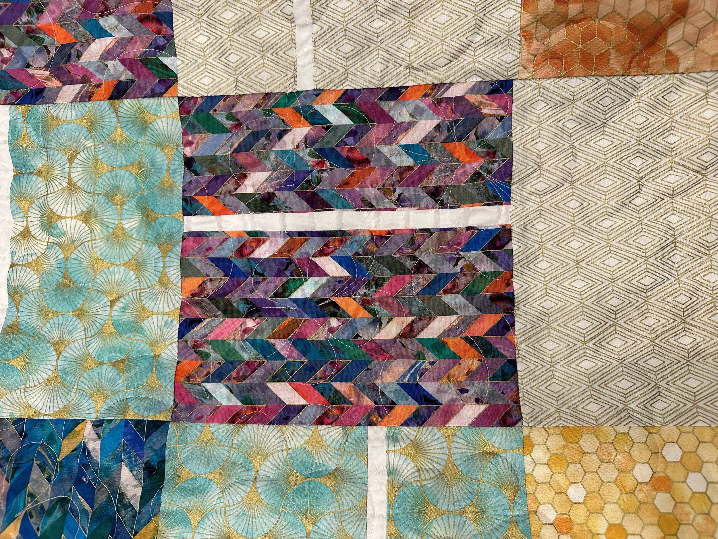 The metallic threads in these fabrics make this quilt shine…Literally! The pattern was designed by Sugar Pine for Villa Rosa Designs. The fabric collection is called Golden Vibes by Lara Skinner. It was quilted with an edge to edge pattern called Morning Song and a pale pink thread called Apricot Blossom and measures 56” x 65”.