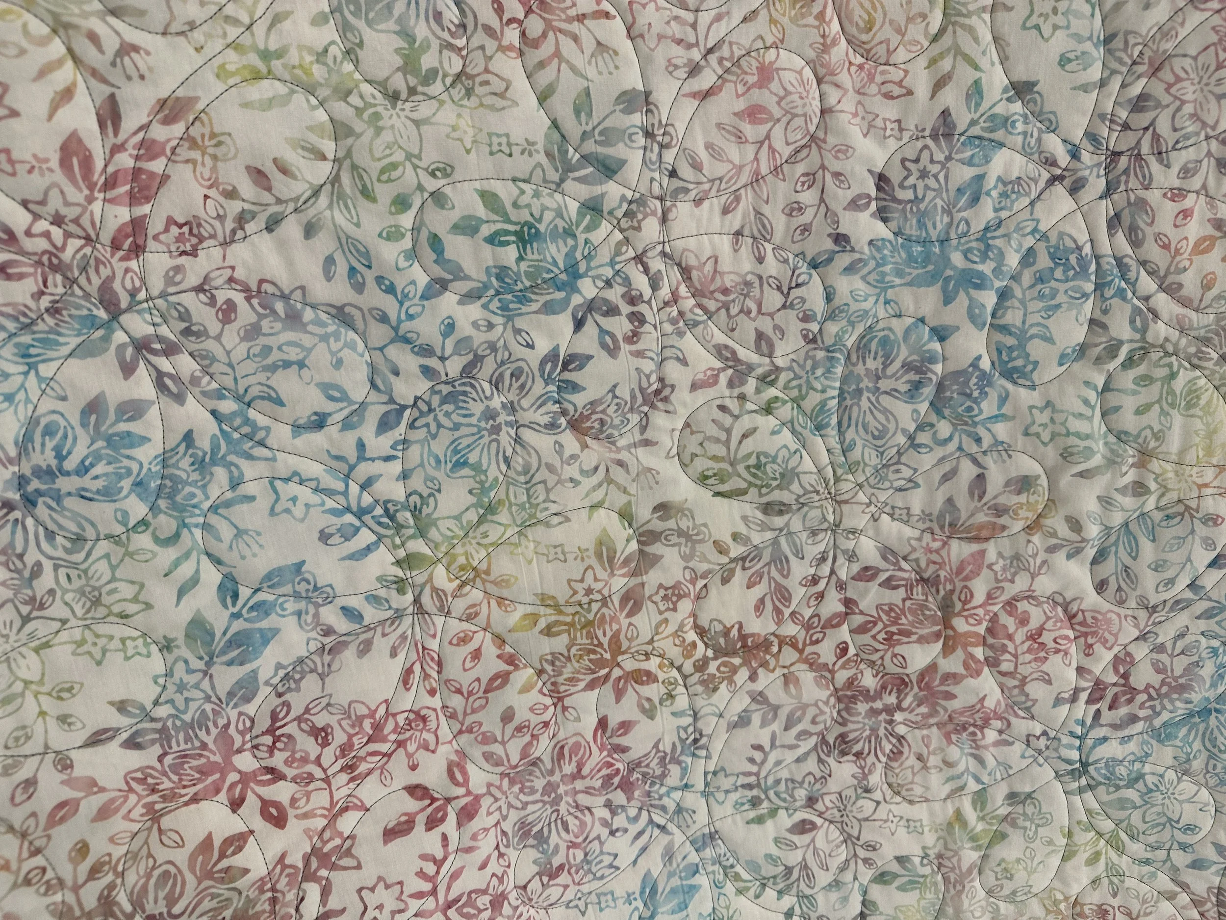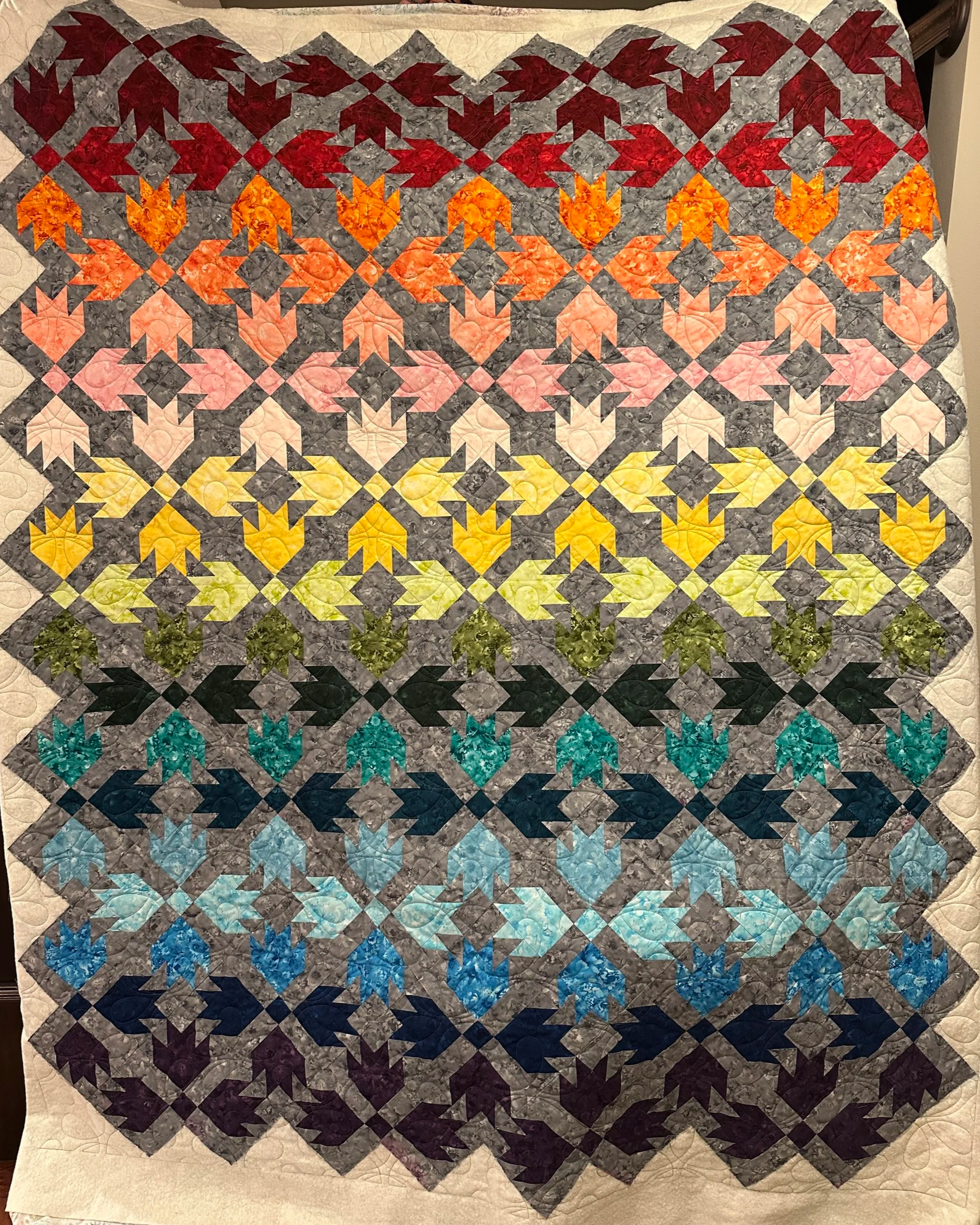 This beautiful gradient quilt uses a Batik fabrics…perfect for Fall! Although the full blocks were used around the edge they will be trimmed off before binding so it will be a rectangular quilt when finished. This quilt was longarm quilted with the edge to edge pattern, Flower Child, and measures 78” x 96”.