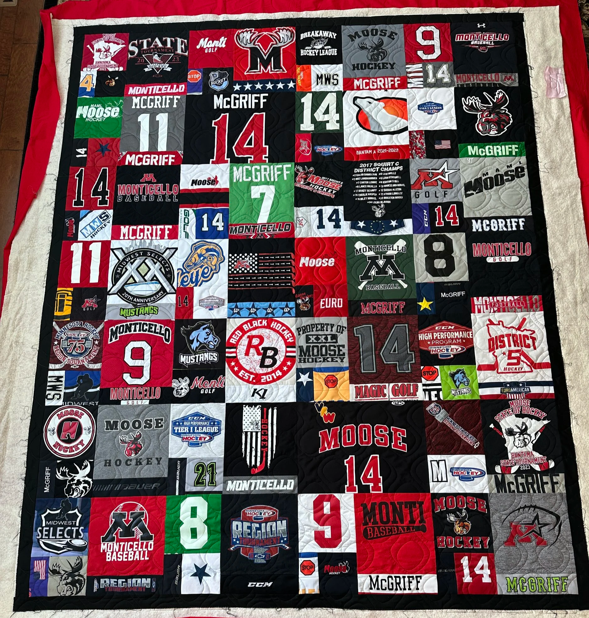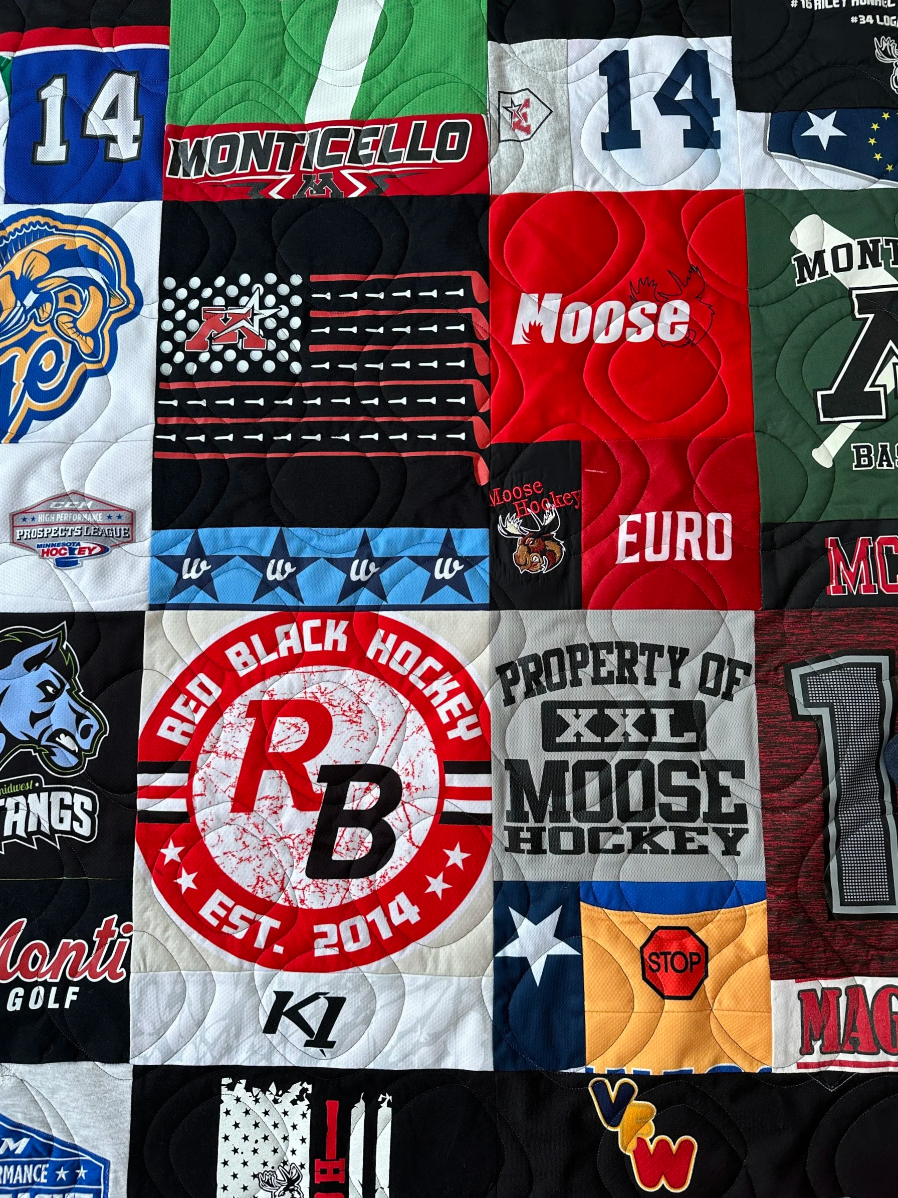 This T-shirt quilt was compiled using lots of pieces from various shirts and jerseys. It measures 87” x 108” and was quilted with the edge to edge pattern, Belly Bop.